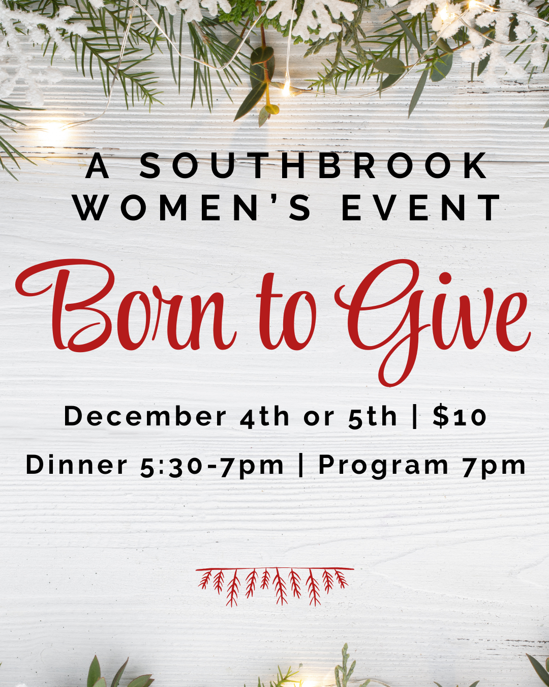 Amid the busyness of the holiday season, it’s easy to lose sight of the true gift of Christmas. Jesus was born to give—and so were you. Take an evening to slow down, enjoy delicious food with other women, and hear an inspiring message from Southbrook Church member and gifted Bible teacher, Helen Ergen