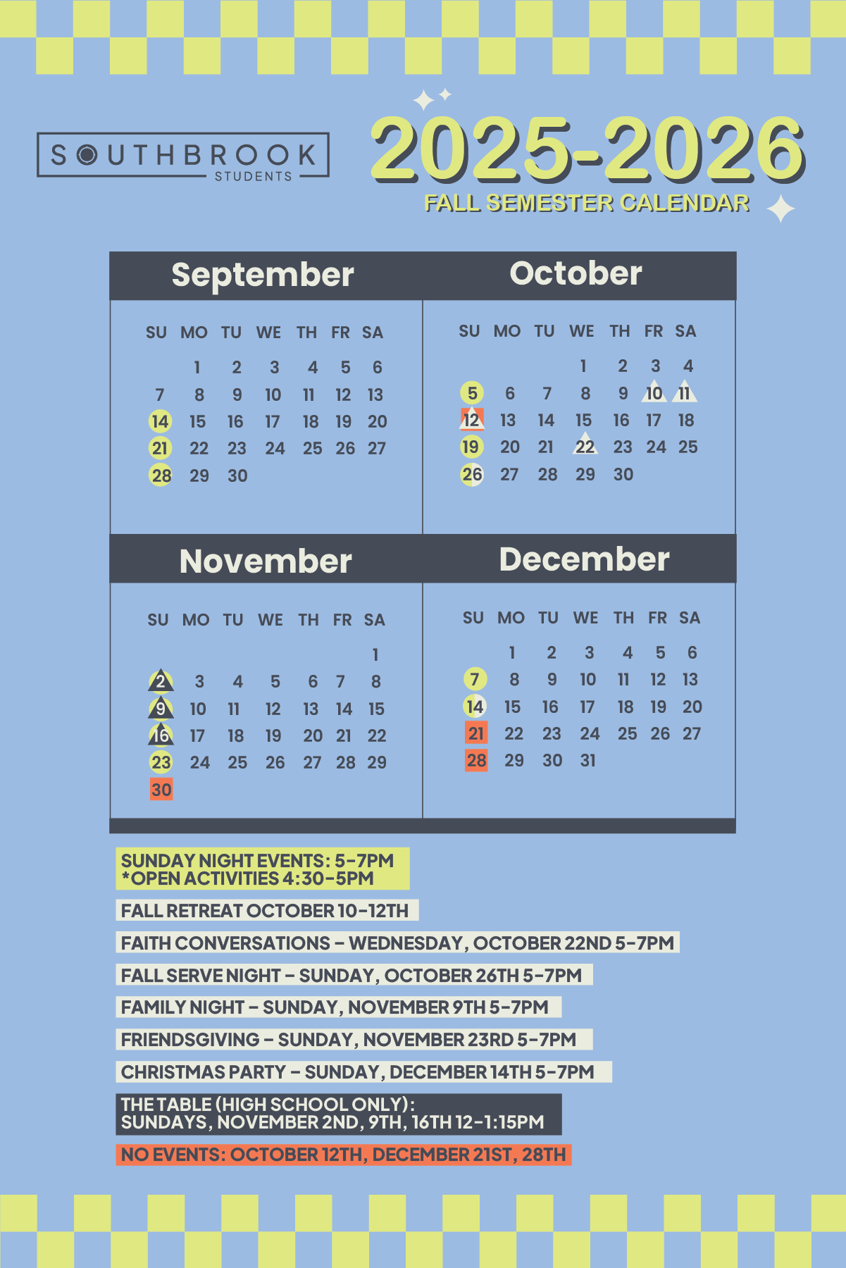 We'll do things like go to Sky Zone, bowling, have a dodgeball tournament, etc... come have fun! Watch for updates to our schedule.