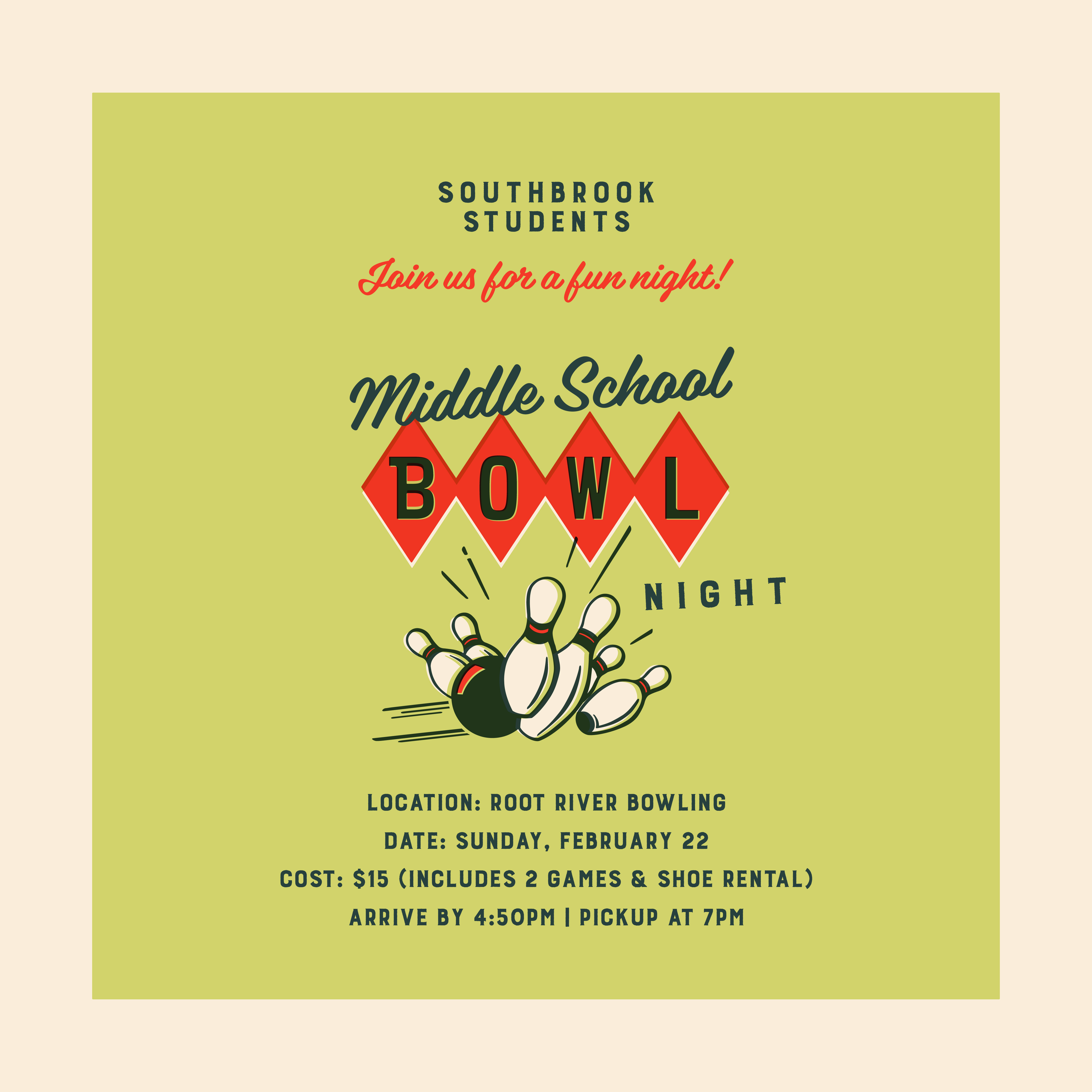 Southbrook Students are hitting the lanes!Where: Root River Center, Franklin, WIWhen: Sunday, February 22ndTime: Arrive at 4:50 PM | Pickup at 7:00 PMCost: $15Bring / Wear: Socks, comfy clothes, and extra cash for snacks. + iCal Export Details Date: February 22, 2026 Time: 4:50 PM Location Root River Center, Franklin Organizer Email cgoetz@southbrook.church Phone (414) 427-1929 Note